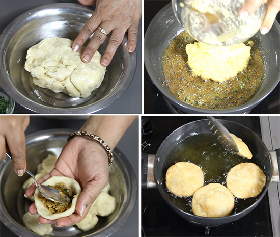 Divide the prepared dough into equal parts and roll one of them to a round bigger than a poori. Add the dal mix over the rolled dough and cover it carefully from all sides to form a rounded ball. This ball must be very tightly covered so oil must not seep inside while deep frying.