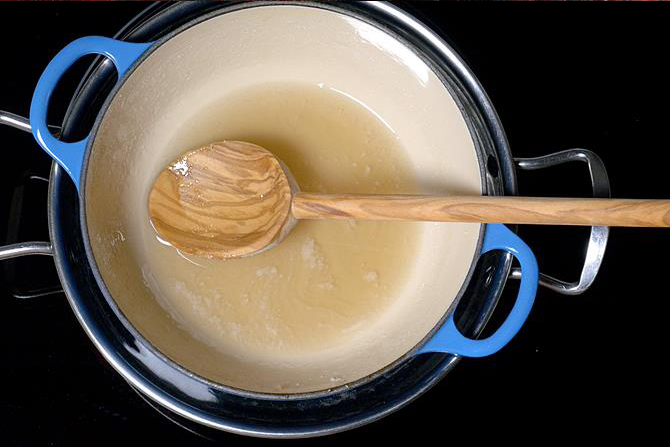 Heat the ghee in a flat-bottomed iron pan or non-stick frying pan.