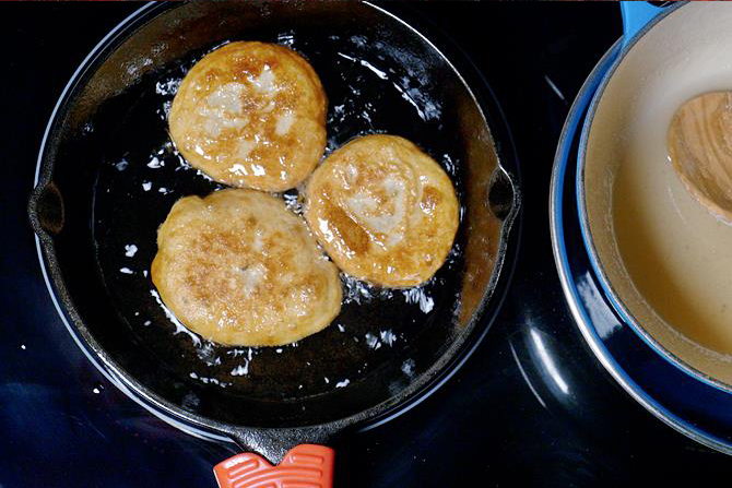 Pour a small ladleful of batter in the hot ghee. It should spread by itself to form a thin round shape and deep fry them from both sides till crispy.