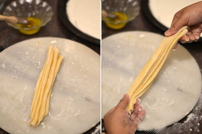 - Brush some ghee on the disk and sprinkle some dough on it. Now take one end of the dough and start pleating it like a fan.