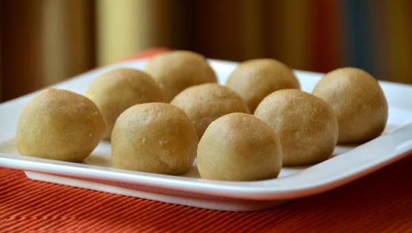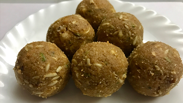Divide into 12 equal portions and roll each portion into Laddoo. Garnish with an almond.