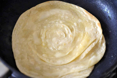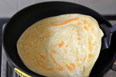 - Keep cooking on medium flame and press the sides with a spatula. Flip again a few times till the paratha is cooked through and no raw spots can be seen. The layers should become more pronounced as the paratha cooks.
