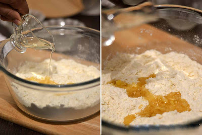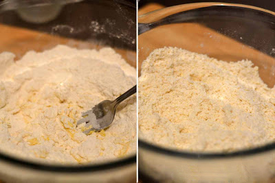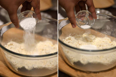- Mix together flour and salt, and add ghee. Rub the ghee with flour in between your palms to form a breadcrumb like mixture.