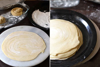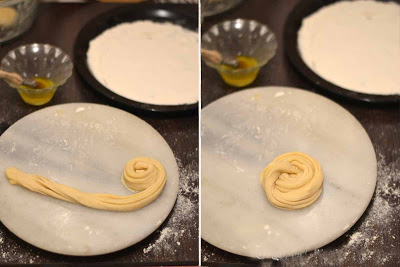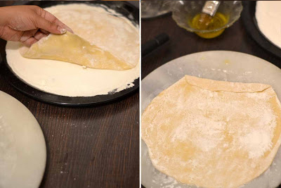 - Brush some ghee on the disk and sprinkle some dough on it. Now take one end of the dough and start pleating it like a fan.